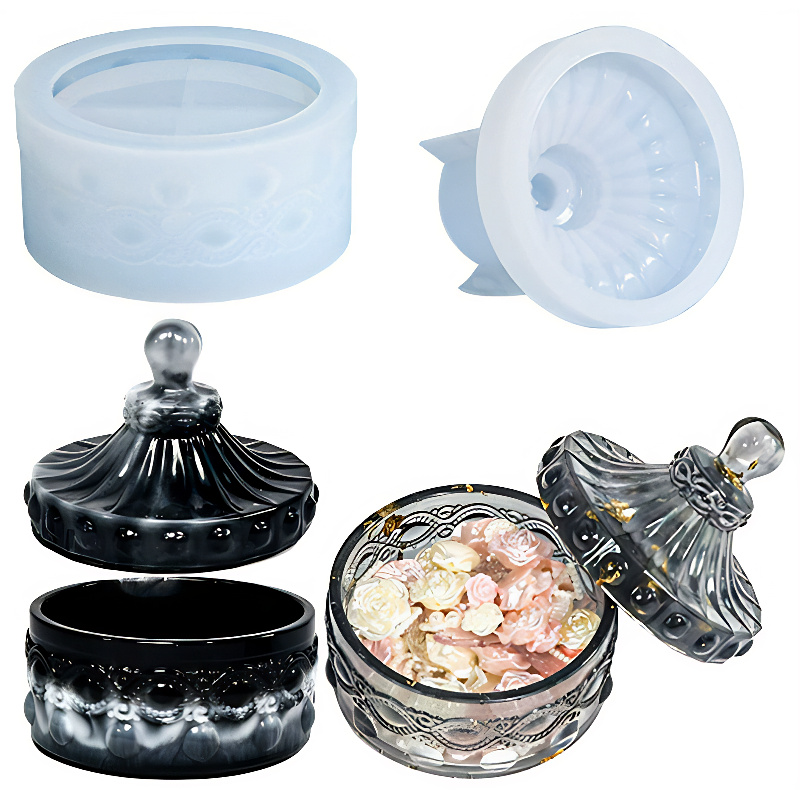 Silicone mould for casting a decorative round container using resin, jesmonite, plaster or wax.