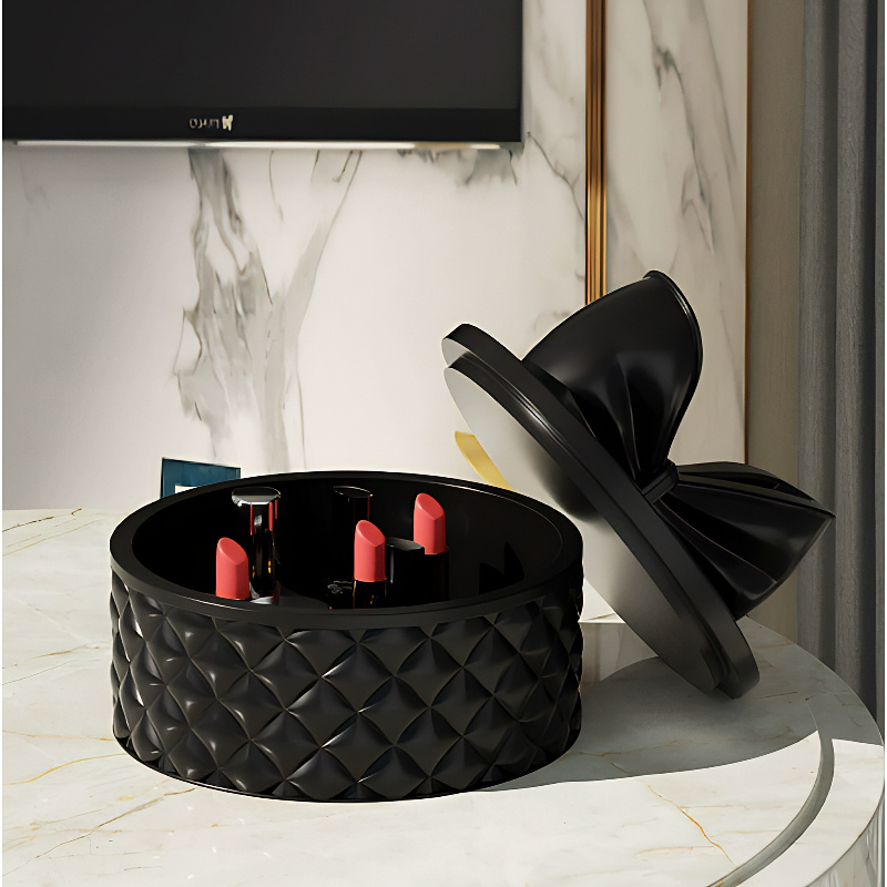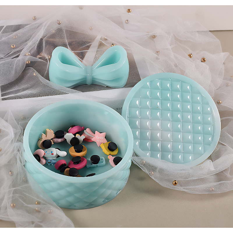 This silicone mould is designed for casting a round storage box with a decorative bow-style lid. The box features a quilted exterior pattern, while the lid incorporates a raised bow detail, creating a presentation-style finish suitable for keepsakes, trinket storage or decorative display.